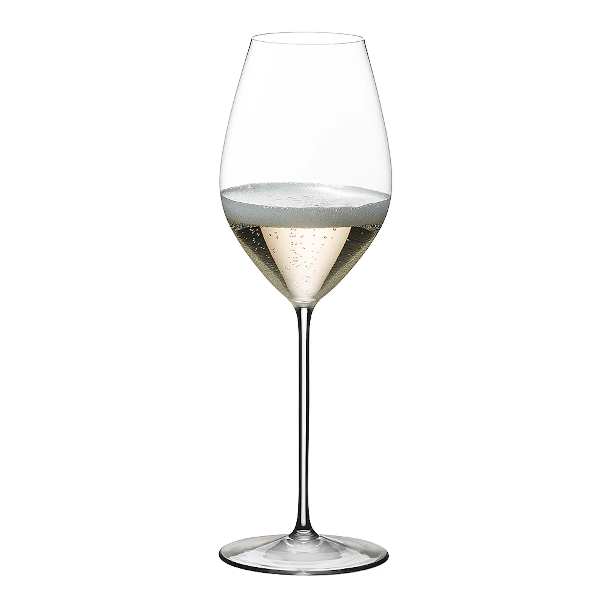 Riedels champagneglas skiljer sig från övriga druvspecifika glas, eftersom champagne enligt tradition görs av mer än en druva. Glaset framhäver en specifik dryck och inte en specifik druva. Kupan är spetsig nertill, vilket gör att det bildas en ström av bubblor inuti glaset som nästan liknar en pelare. Denna formation är inte bara vacker att se på utan gör också att champagnens ”liv” förlängs. Kupans vida mittparti lyfter aromerna i drycken och den avsmalnande öppningen koncentrerar i sin tur doften till näsan. Öppningen styr även drycken till tungans främre del, vilket gör att upplevelsen av sötma blir större.